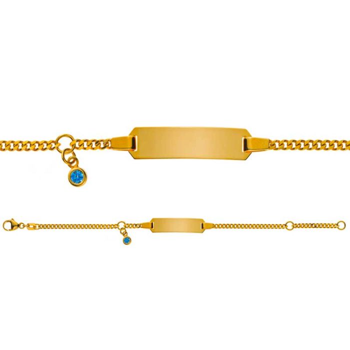 Übsches 375 Gelbgold Identitätsarmband, mit Zirkonia-Einhänger blau, mit Gravurplatte rechteckig lang auf dem Sie den Vornamen des Kindes gravieren können.