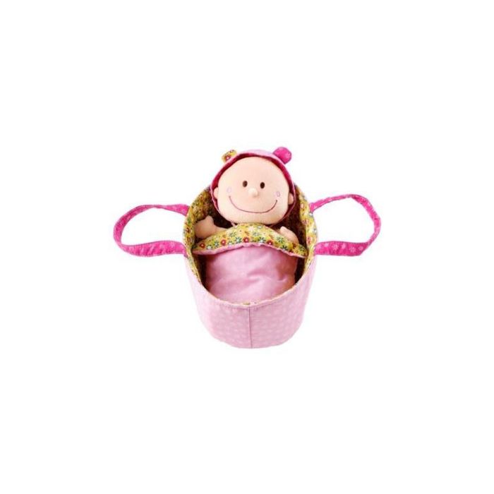 Baby Puppe Chloé von Lilliputiens ist in seinem kleinen gemütlichen Babytragekorb unter seiner Decke im bequemen Bett.