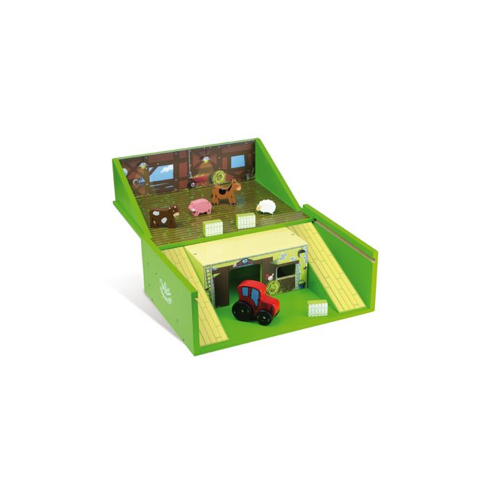 Aufklappbare Bauerhof von Vilac. Ein Spielbox aus Holz ideal zu mitnehmen (im Restaurant zum Beispiel). Kommt mit Traktor, Tieren und ZubeHör. Ab 3 Jahre alt.