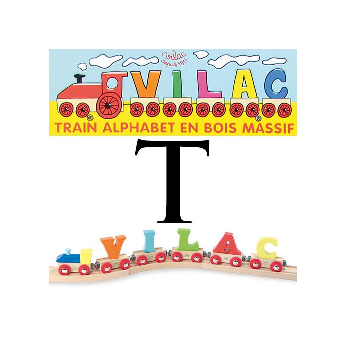 Buchstabenzug von Vilac. So lernt Ihr Kind die Buchstaben (Vorname oder Alphabet). Die Lokomotive und die Wägen dez Zuges sind magnetisiert.