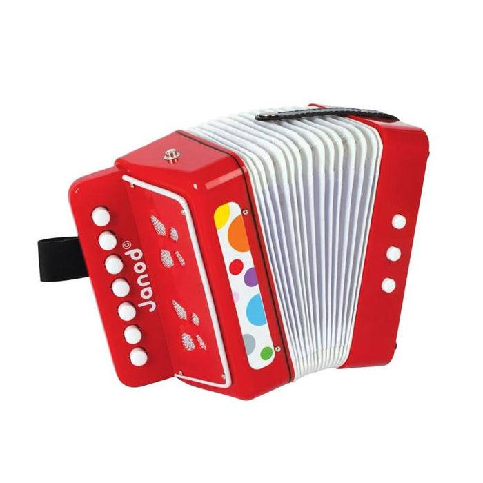 CONFETTI Akkordeon mit 7 Musiktasten und 3 Tasten zum Ändern der Tonart. CONFETTI ist eine komplette Serie von Musikinstrumenten mit Pop N’ Rock Motiven! CONFETTI regt alle Sinne an und ermöglicht kleinen Musikern, sich mit den Freuden der musikalischen Improvisation vertraut zu machen.