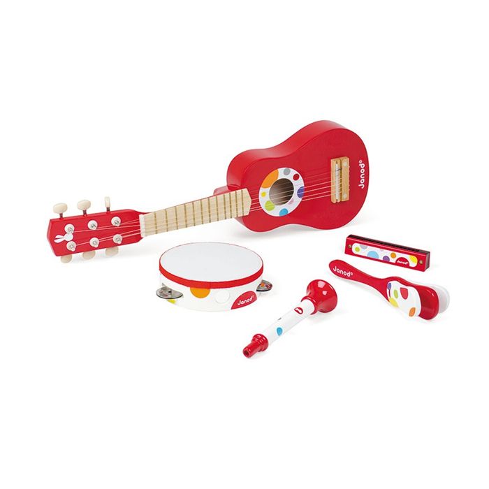 Schellentrommel, Gitarre, Harmonikas, Trompete, Klapper in einem schönen Musikset von Janod. Geschenk für Kinder ab 3 Jahr.