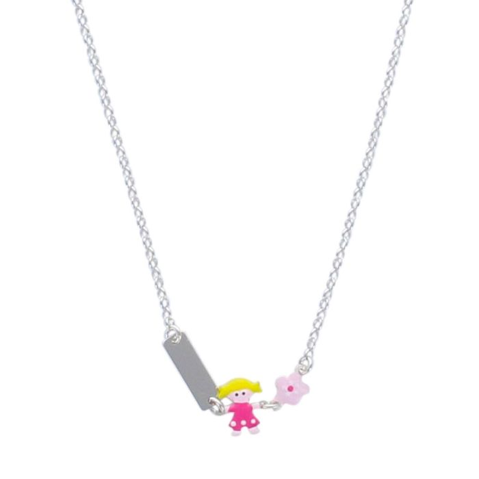 Halskette für Baby aus 925er Silber, mit zwei schönen Motiven: ein kleines Mädchen und eine Blume.