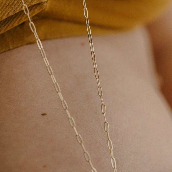 Die Kette ist mit zarten Gliedern aus Gelbgold verziert, die ihr einen zeitlosen Charme und einen anspruchsvollen Look verleihen. Jedes Glied ist sorgfältig verarbeitet, um eine glatte, glänzende Oberfläche zu gewährleisten, die Ihrem Look als werdende Mutter einen Hauch von Glamour verleiht.