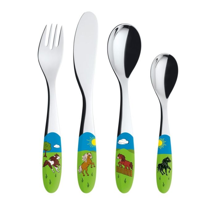 Kinder lieben Pferde. Mit den bunten Motiven des Kinderbesteckes MORIS sind die übermütigen Vierbeiner immer mit am Tisch und sorgen somit für Heiterkeit und fördern die Kreativität.