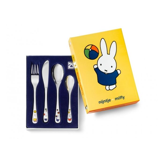 Beliebtes 4-teiliges Besteckset des weltberühmten Kaninchens miffy, mit Autogramm von Dick Bruna. Auf allen Besteckteilen ist Kaninchen miffy abgebildet.