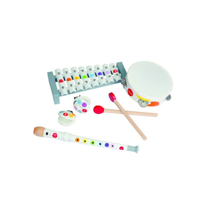 Konfetti Musikalisches Set für Kinder von Janod mit: 1 Metallxylofon mit 8 Klangstöben, 1 Schnellentrommel, 1 Flöte, 1 Paar Kastagnetten.