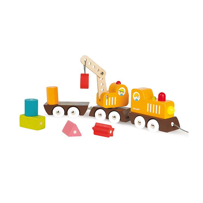 Holzzug mit Lokomotive, drehbaren Kran und Anhänger mit 5 verschiedenen magnetischen Holzteilen. Mit dem Kran können die Holzteile leicht auf- und abgeladen werden; zugleich lernt das Kind Farben und Formen zu unterscheiden. Holz: Pinie (Basisfahrzeug), MDF (Lokomotive und Kran), Kirsche (Holzteile).