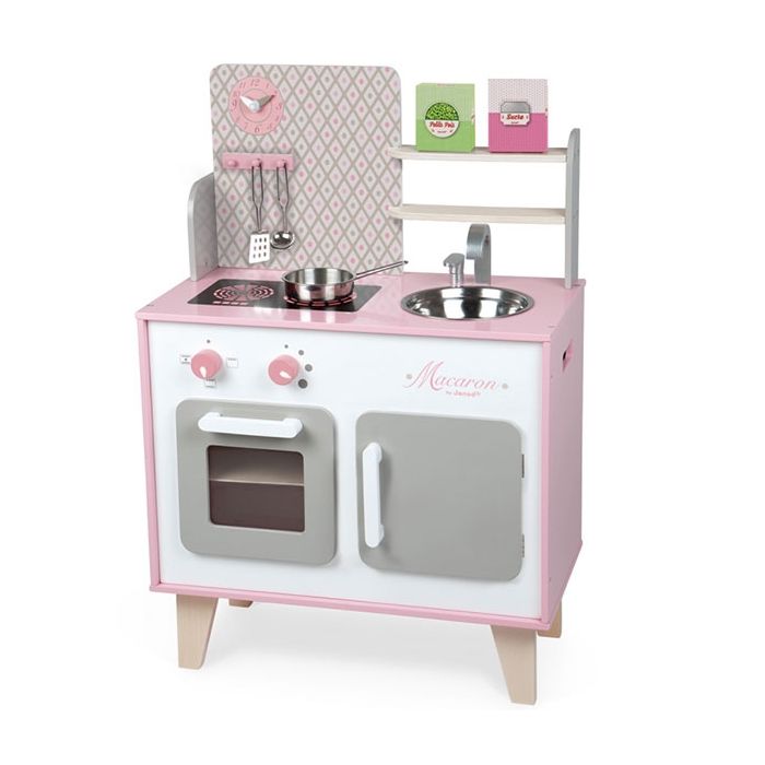 Große Küche aus Holz mit 5 Teilen Zubehör. Zarte, moderne Farbgebung in Rosa. So wie Mama – bereite leckere kleine Gerichte für Deine Freunde vor und werde ein echter Küchenchef!!! Macaron – Maxi-Küche aus Holz mit Haken zum Aufhängen der zwei Metalllöffel, einer Metallpfanne und zwei Lebensmittelpackungen aus Karton (Erbsen und Zucker).