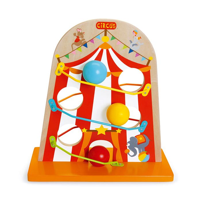 Spiel zusammen mit den Zirkustieren mit dieser tollen Kugelbahn. Drücke die Kugeln oben durch die Öffnung.