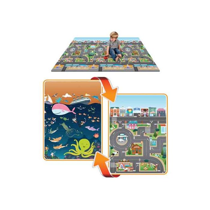 Mega Spielmatte mit riesiger fläche: 176 x 198 cmBereitet Ihrem Kind jahrelang Spass! Nach versteckten Charakteren suchen, die Figuren zählen, die Verkehrszeichen lernen: der Kreativität sind keine Grenzen gesetzt!Mit wunderschönen Illustrationen auf beiden Seiten.Geliefert mit einer praktischen Tragetasche für einfaches und bequemes Verstauen (57,5 x 12,7 x 45,27 cm).Wasserdicht und einfach zu reinigen: schützt vor Verschütten von Getränken etc. beim Spielen.100% schadstoff-frei.