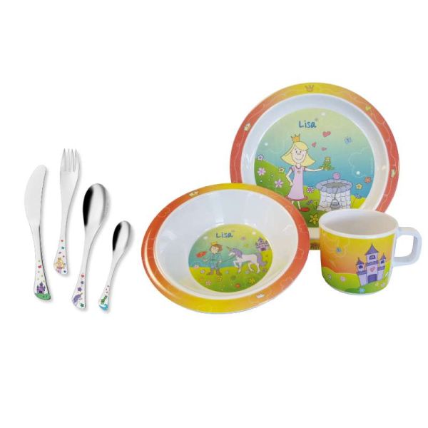 - 1 4-teiliges Besteckset aus Edelstahl: Bestehend aus Gabel, Messer, Suppen- und Dessertlöffel, ist jedes Besteck mit zarten Illustrationen von Prinzessinnen, Schlössern und verzauberten Tieren verziert und kann individuell gestaltet werden.