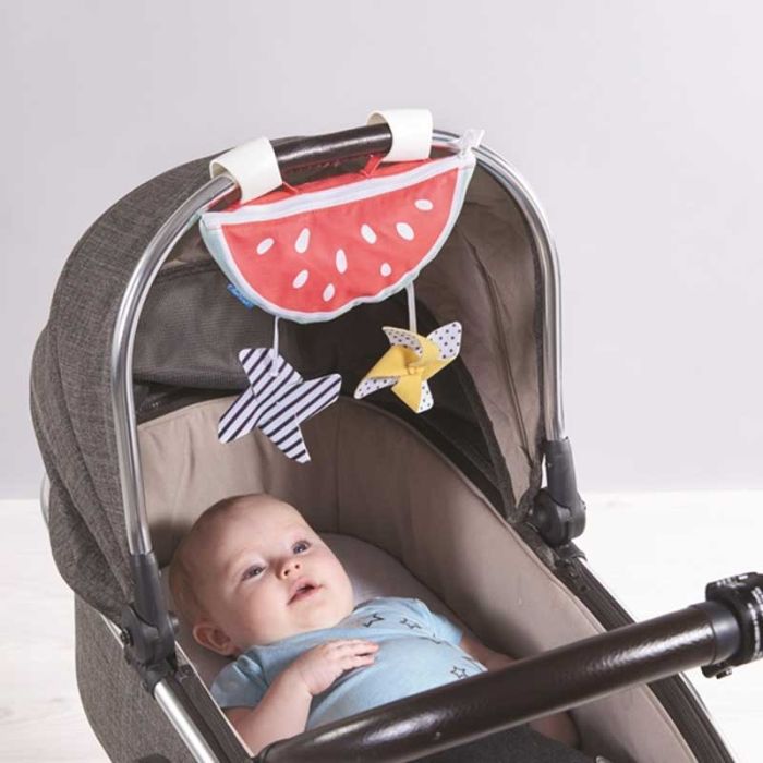 Sonnenschutz für den Kinderwagen mit einer Wassermelonentasche und hängendem Spielzeug für Babies Spass und Entertainment während dem Spazieren.