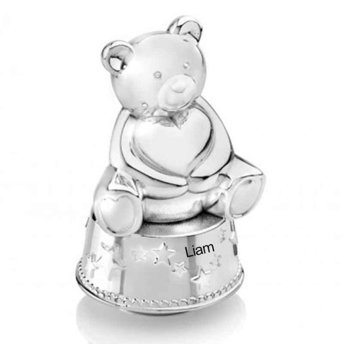 Dieser niedliche kleine Bär ist sowohl eine Spardose als auch eine schöne Spieluhr. Der Bär dreht sich um und tanzt zu den Klängen von "La Vie en Rose". Die Spardose ist aus Silber gefertigt und kann zwischen den Sternen graviert werden.
