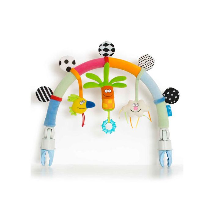 Mit Plastikclips, die das Befestigen dieses Spielbogens an den meisten handelsüblichen Kinderwagen, Autositzen und Wippen kinderleicht machen.