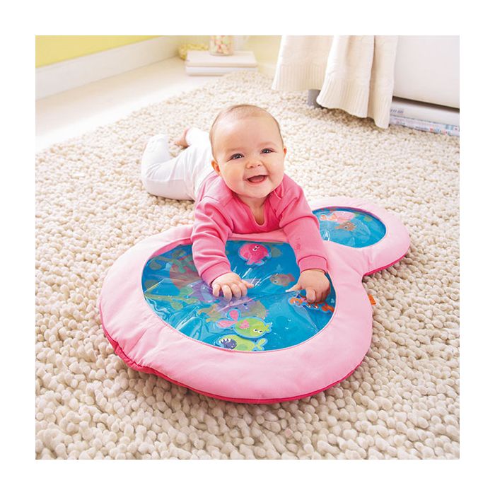 Das macht Spaß und stärkt die Motorik in Bauchlage. Die mit Wasser gefüllte Matte ist von einer weichen Stoffhülle umgeben, sodass Babys angenehm liegen.